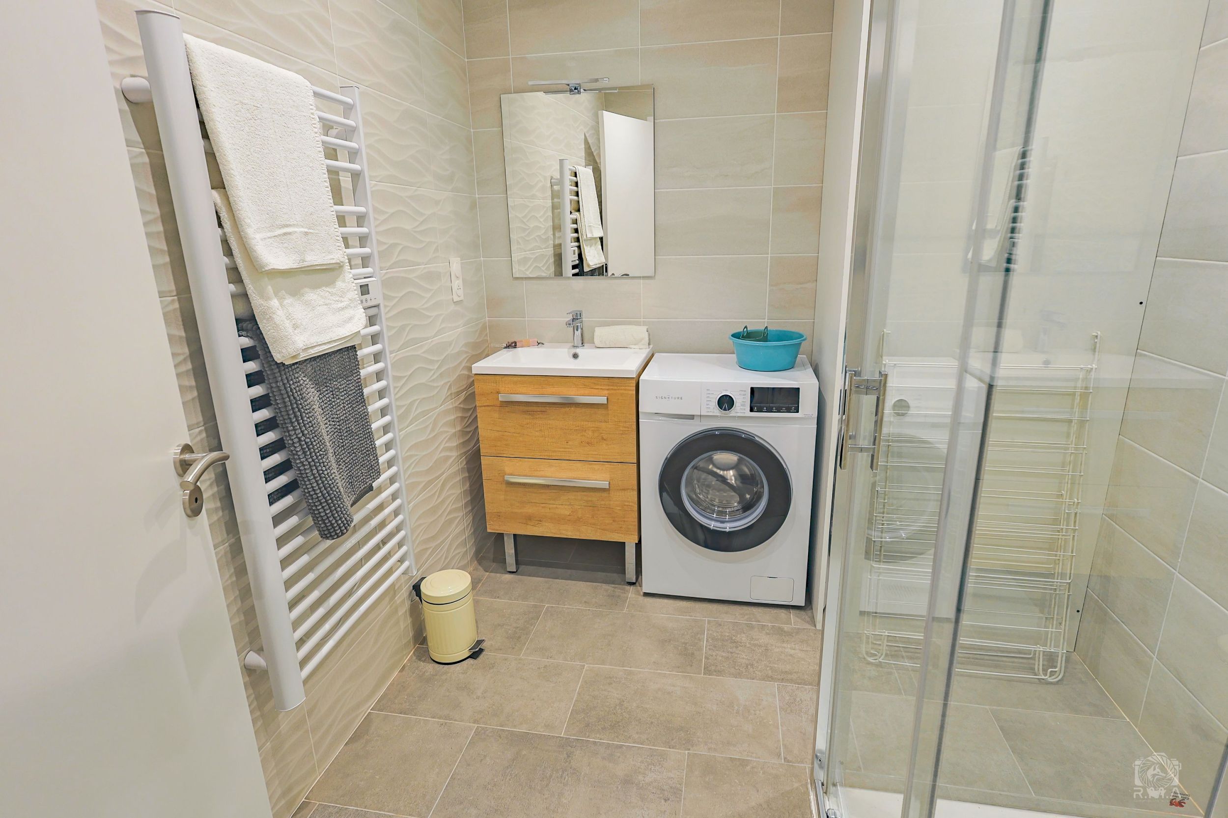 - Salle d’eau à partager : douche, sèche-serviette et sèche-cheveux à ions.